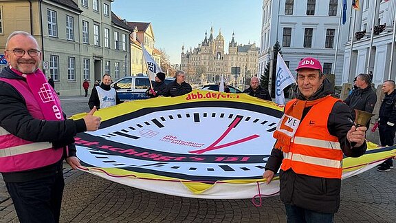 Die Bildungsgewerkschaften im dbb m-v haben heute vor der Schweriner Staatskanzlei die Aktionswoche “Jetzt schlägts 13!” gestartet und senden ein deutliches Signal nach Potsdam: Wir fordern 7 Prozent, mindestens jedoch 300 Euro mehr!