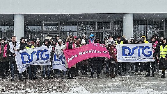 Über 50 Kolleginnen und Kollegen des Finanzamtes Rostock haben am 2. Februar 2026 gemeinsam für mehr Gehalt und Anerkennung an der aktiven Mittagspause des Ortsverbandes der DSTG MV teilgenommen.