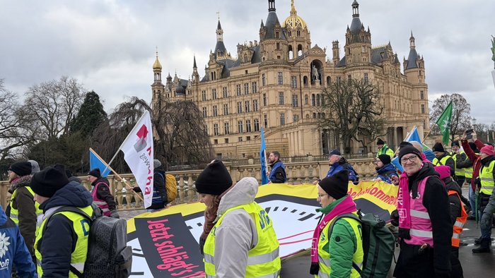 In ganz Mecklenburg-Vorpommern waren die Landesbeschäftigten zum Warnstreik aufgerufen. In Schwerin trafen sich zahlreiche Demonstrierende mittags auf dem Bertha-Klingberg-Platz und zogen anschließend zur Kundgebung Richtung Staatskanzlei. Die Gewerkschaften fordern eine Erhöhung der Tabellenentgelte um sieben Prozent, mindestens jedoch 300 Euro.